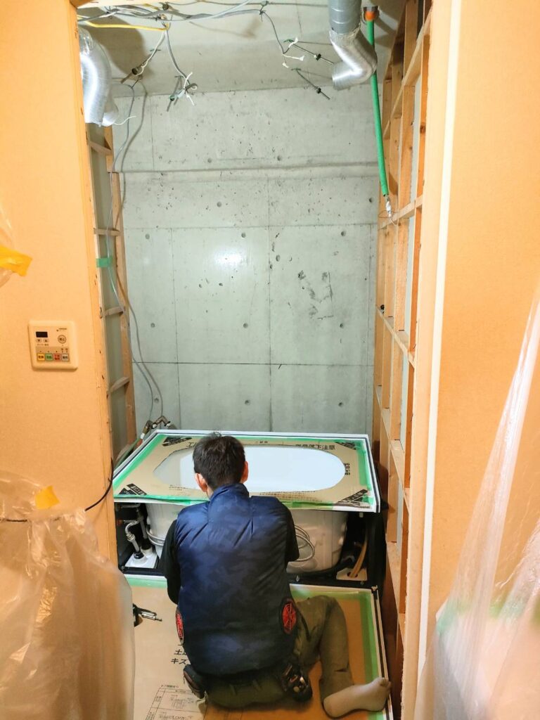 今回はそんなユニットバス施工と、洗面化粧台取替施工の現場風景をご紹介させていただきます。